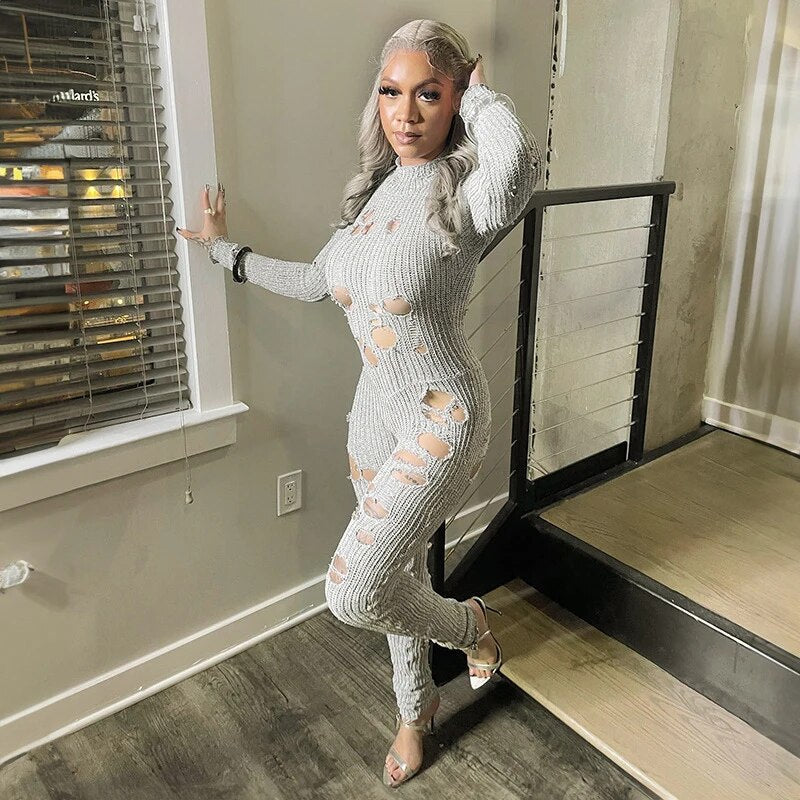 Hollow Ripped Knitted Jumpsuit